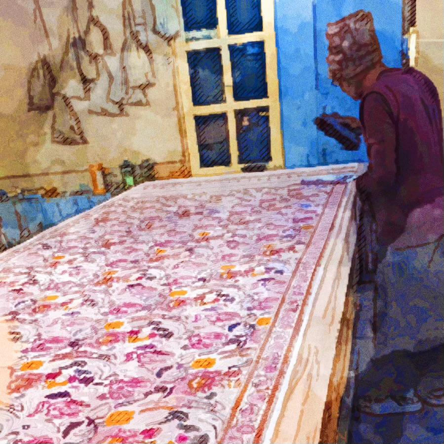 Parvai’s work in Bagru is rooted in centuries-old hand-block printing traditions, where artistry and community coexist in harmony. We collaborate with three renowned printer families from the Chhipa community, supported by over fifty artisans who master Dabu resist printing, natural dyeing, and block carving. Our most outstanding achievement has been the revival of Gawarwali Dabu Fadat prints on handwoven silk and cotton, a rare, complex technique demanding immense precision and patience. Each fabric, textile, and home piece is created through Parvai’s dialogue with these artisans, reflecting Bagru’s living heritage where every motif is guided by sun, water, and earth, and every creation honours nature, collaboration, and the enduring beauty of handmade tradition